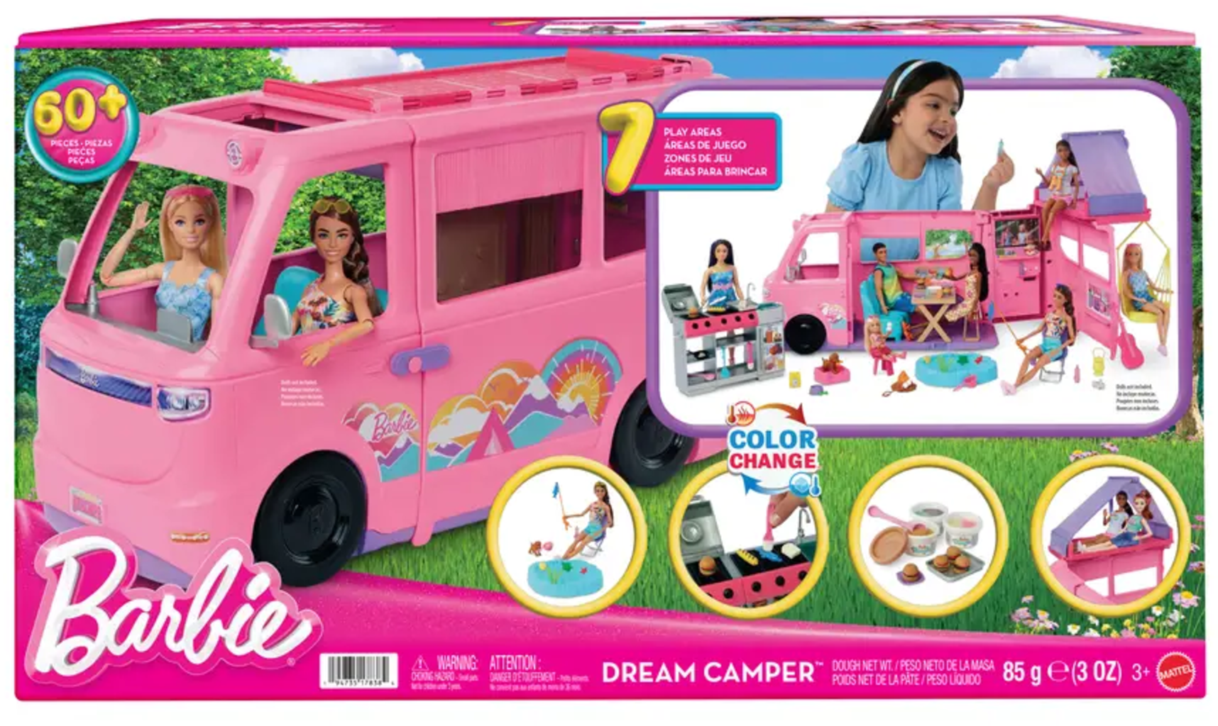 Mit dem Barbie Super Abenteuer-Camper Spielset warten endlose Abenteuer in der Natur! Der Camper lässt sich öffnen und bietet ein Pop-up-Dachzelt, Wohnzimmer, Essbereich und Badezimmer. Über 60 Zubehörteile wie Grill mit Farbwechseleffekt, Hängesessel, Angel, Picknickutensilien und ein süßes Hündchen sorgen für kreativen Spielspaß. Kinder können eigene Campinggeschichten erfinden, vom Angeln bis zum Marshmallow-Rösten – der Camper ist der perfekte Begleiter für fantasievolles Spielen. Puppen nicht enthalten.