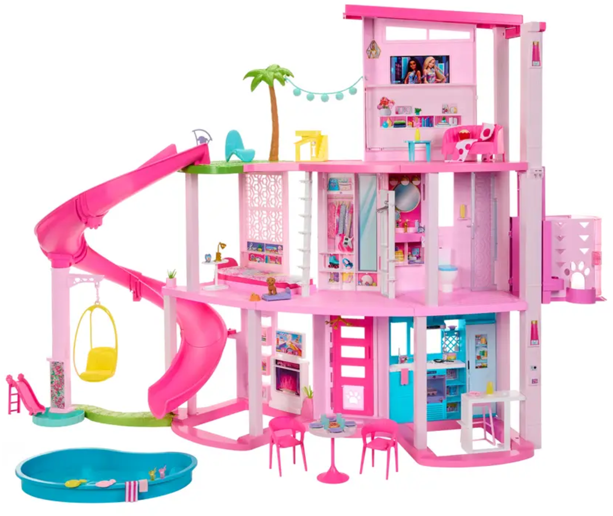 Barbie Traumvilla, mehr als 75 Teile, Poolparty-Puppenhaus mit Rutsche über 3 Etagen