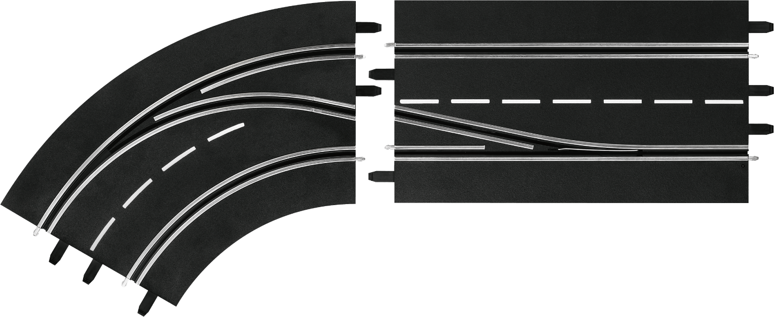 Sorge für noch mehr Nervenkitzel auf deiner Carrera-Bahn! Diese Spurwechselkurve besteht aus zwei Schienenteilen und bietet eine Überholmöglichkeit von der inneren auf die äußere Spur. Ideal für taktische Überholmanöver. Auch für die digital nachgerüstete Carrera EVOLUTION Bahn geeignet.