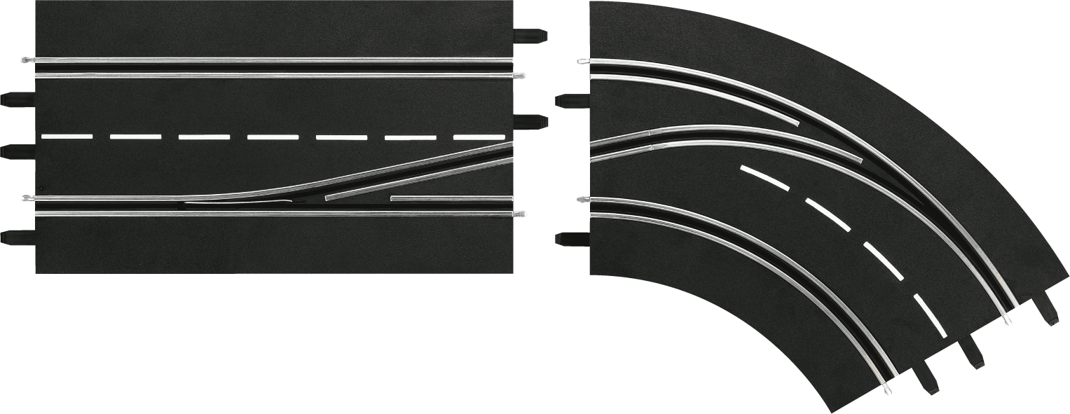 Gib Gas und wechsel die Spur, um andere Rennwagen hinter dir zu lassen. Diese Spurwechselkurve besteht aus zwei Schienenteilen und bietet eine Überholmöglichkeit von der inneren auf die äußere Spur. Auch für die digital nachgerüstete Carrera EVOLUTION Bahn geeignet.