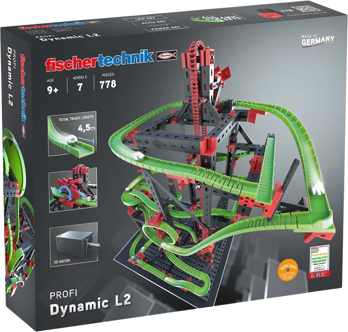 Mit PROFI Dynamic L2 geht es richtig rund! Die Kugeln sausen durch Highspeed-Flexschienen, Loopings, Kreiseltrichter und mechanische Weichen. Über Wippen und Kurven erleben Kinder actionreiche Momente und können ihre eigenen Parcours kreieren. Gleichzeitig lernen sie spielerisch physikalische Grundlagen wie Beschleunigung, Massenträgheit und Energieerhaltung. Mit dem mitgelieferten XS-Motor werden die Kugeln immer wieder nach oben transportiert – so bleibt der Spielspaß endlos!