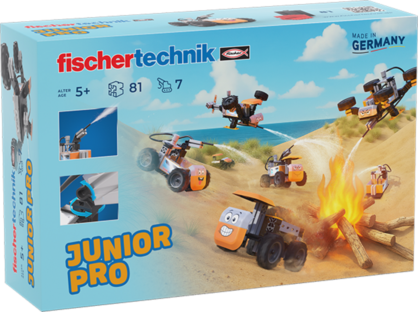 Mit Junior Pro können Kinder ab 5 Jahren spannende Fahrzeuge wie Löschfahrzeuge, Drohnen oder Güterwagen selbst zusammenbauen und steuern. Jedes der sieben Modelle bietet neue Funktionen und Abenteuer für noch mehr Spielspaß.
