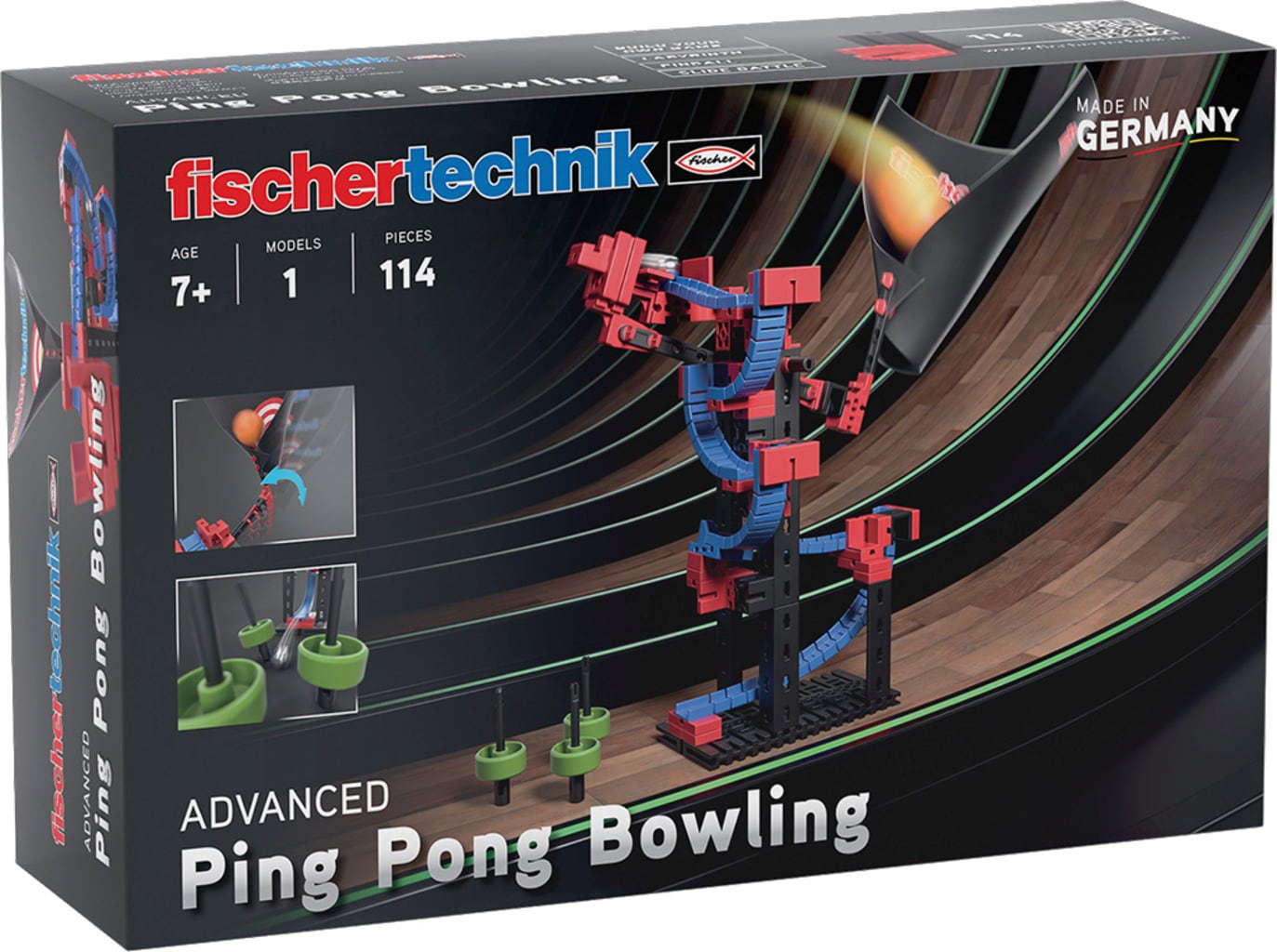Mit dem fischertechnik ADVANCED Ping Pong Bowling erwartet dich ein actionreiches Kombinationsspiel: Erst heißt es zielen und den Ball präzise werfen – und landet er im Trichter, startet die Kugelbahn von selbst. Am Ende warten die Kegel darauf, von dir umgestoßen zu werden! Ein tolles Set für alle Kinder, die Spaß am Bauen haben und gern ihre Geschicklichkeit auf die Probe stellen.