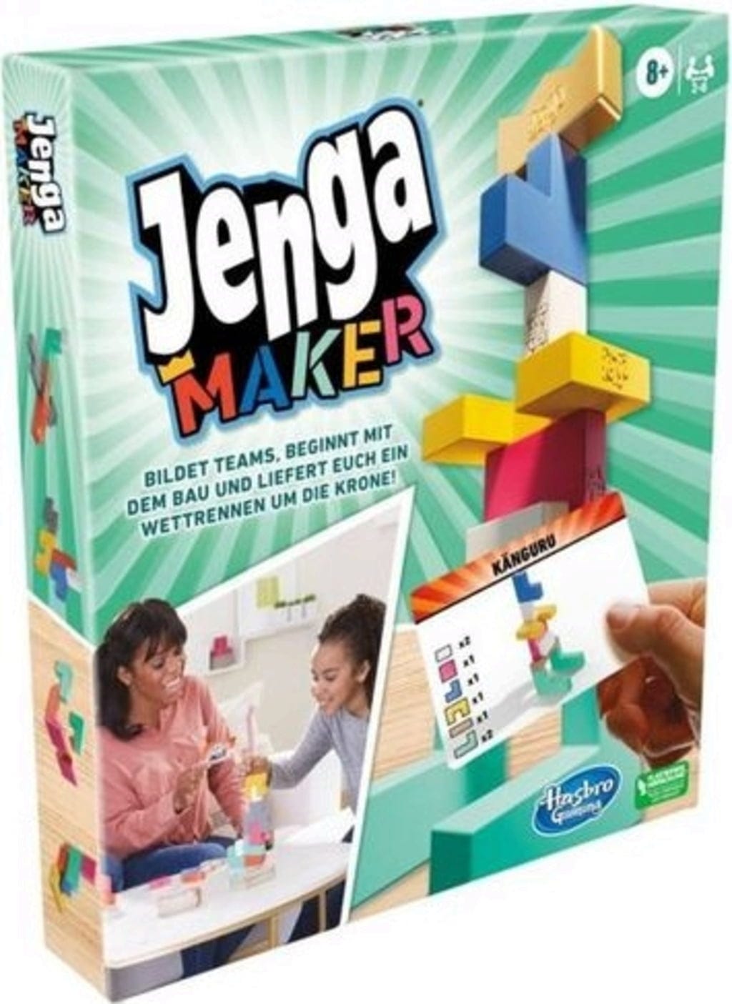 Inhalt: 28 Holzklötze, Holzkrone, 200 Jenga Maker Karten, Anleitung