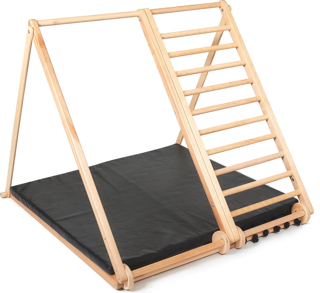 Die dreieckige Variante Zebra besteht aus gut gepolsterter Matte, Sprossenleiter und Kletternetz. So kann die Spitze der Pyramide auf zwei verschiedene Arten erklommen werden. Das Netz fühlt sich am bloßen Fuß sehr angenehm an, massiert und fördert die Fußbildung. Darüber hinaus kann das Gerüst mit wenigen Handgriffen besonders platzsparend zusammengeklappt werden.