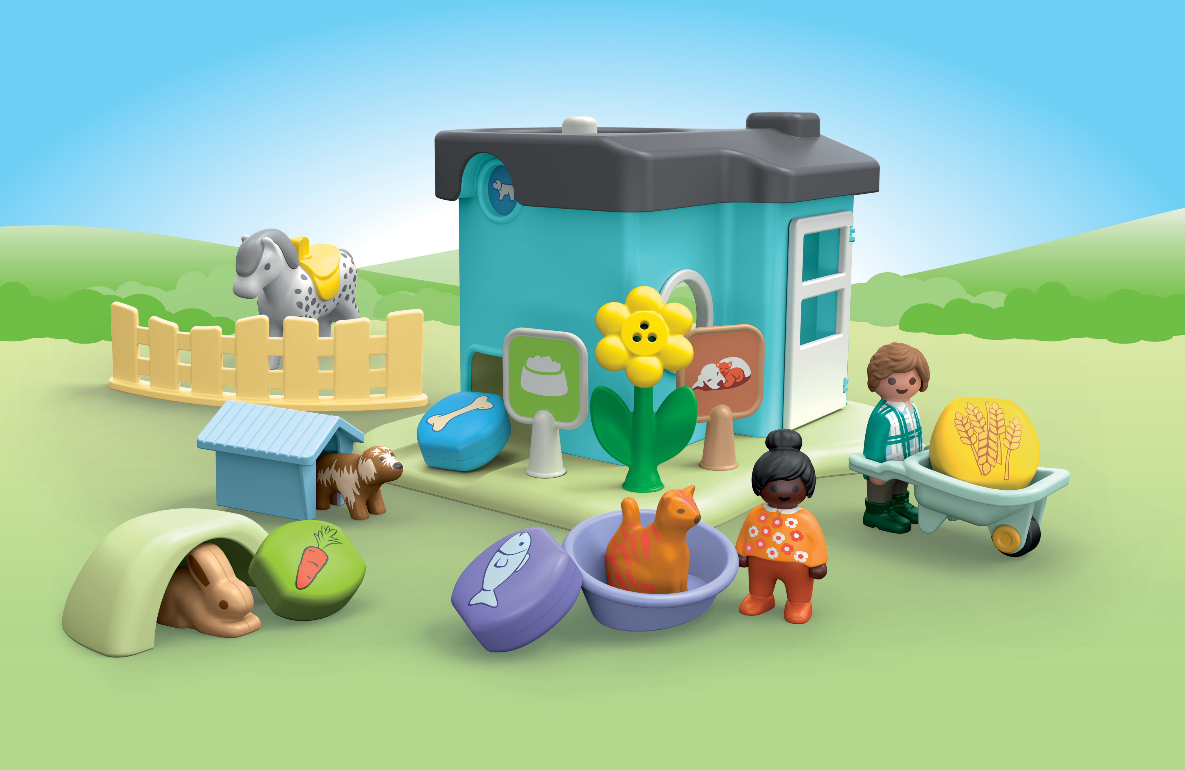 Zubehör: 1 Tierpension mit Futterspender, 1 Hundehütte, 1 Katzenkorb, 1 Hasenhöhle, 4 Futtersteine, 1 Schubkarre, 1 Zaun, 2 Schilder, 1 Blume