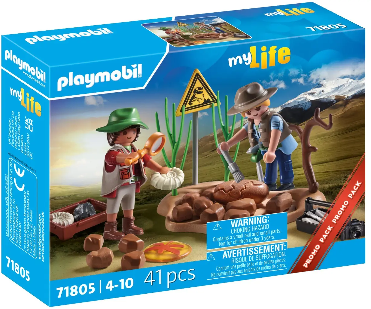 Inhalt: 1 Mann, 1 Frau, 1 Bodenplatte mit Ast und 2 Sträuchern, 1 Erdelemente zum Buddeln, 1 Warnschild, 1 Handwerkskiste mit Forscher-Equipment, 1 Lupe, 1 Kiste mit Fossilien