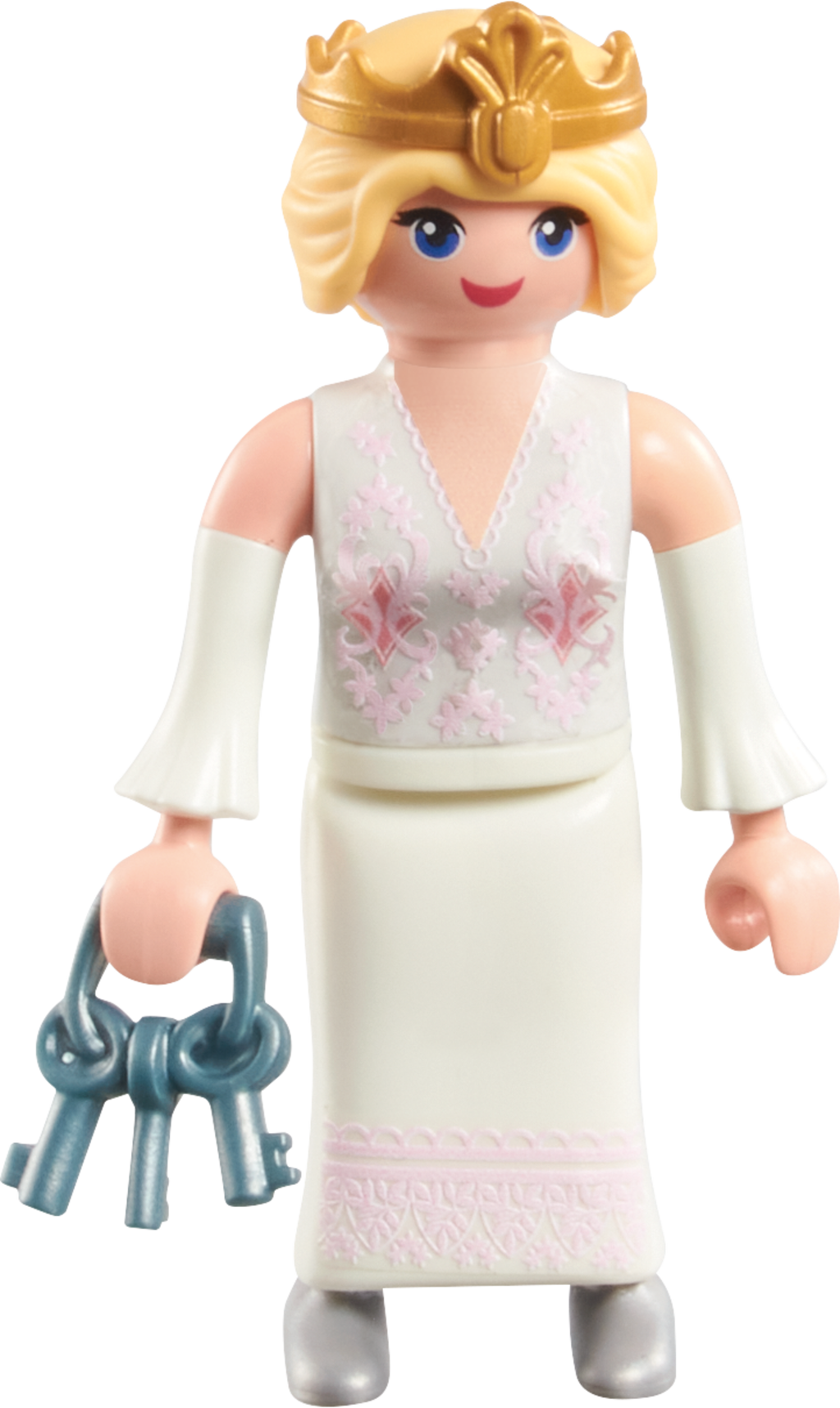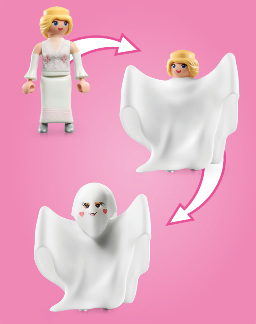 Inhalt: 1 Prinzessin, 1 Krone, 1 Geistkostüm, 1 Geisthaube, 1 Tisch, 1 Schlüsselbund, 1 Kerzenständer, 1 Kerze