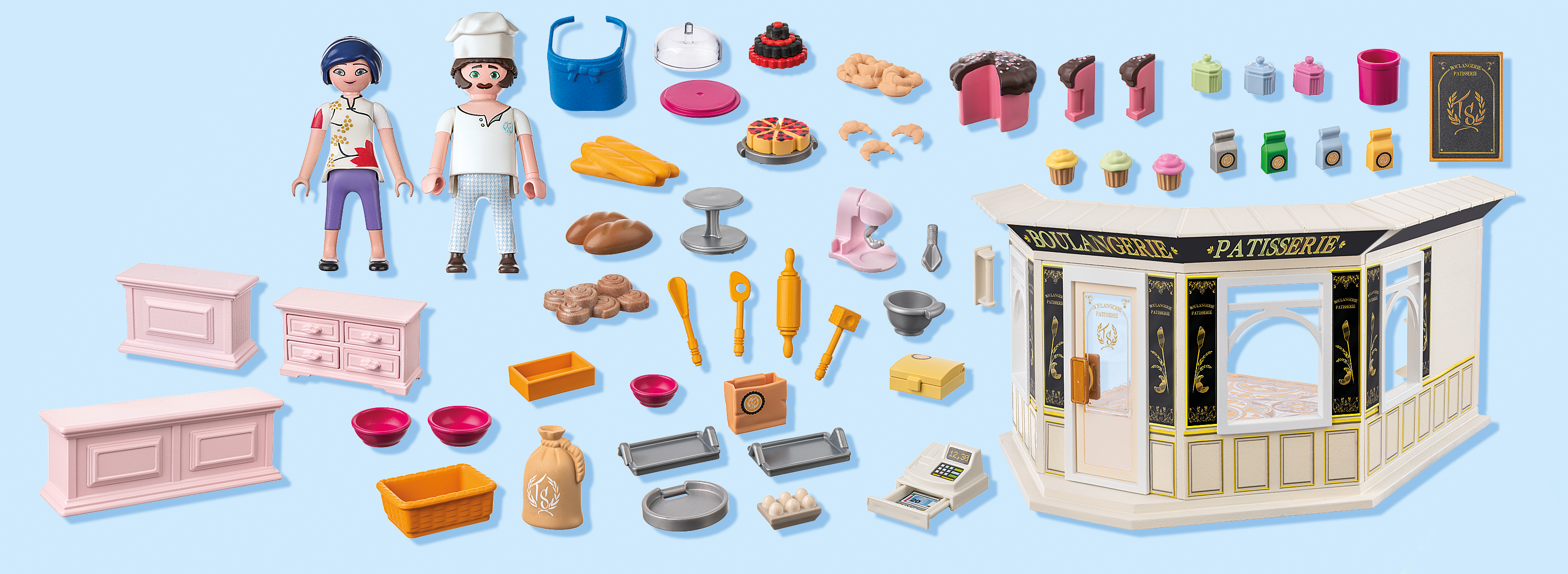 Inhalt: 1 Frau, 1 Mann (Sabine Cheng & Tom Dupain), 1 Bäckereigebäude, 1 Schürze, 1 Kochmütze, 1 Schild mit Befestigung, 1 Theke lang, 2 Theken kurz, 1 Sideboard mit Schubfächern, 1 Korb, 1 Tüte, 1 Schachtel, 1 Eimer, 1 Etagere, 1 Kiste, 2 Tabletts, 1 Kuchenplatte mit Haube, 1 Tablett rund, 1 Kasse, 1 Macaron Torte, 3 Muffins, 3 Croissants einzeln, 1 Croissants zusammenhängend, 1 Zimtschnecken, 1 Torte, 2 Tortenstücke, 1 Kuchen, 1 Kuchenstück, 1 Baguette, 1 Weißbrot, 3 Schüssel, 1 Küchenmaschine mit Schüssel, 1 Knethaken, 1 Rührhaken, 1 Ei, 3 Zuckerdosen, 4 Lebensmitteltüten, 1 Mehlsack, 1 Kochlöffel, 1 Fleischklopfer, 1 Rührbesen, 1 Teigroller
