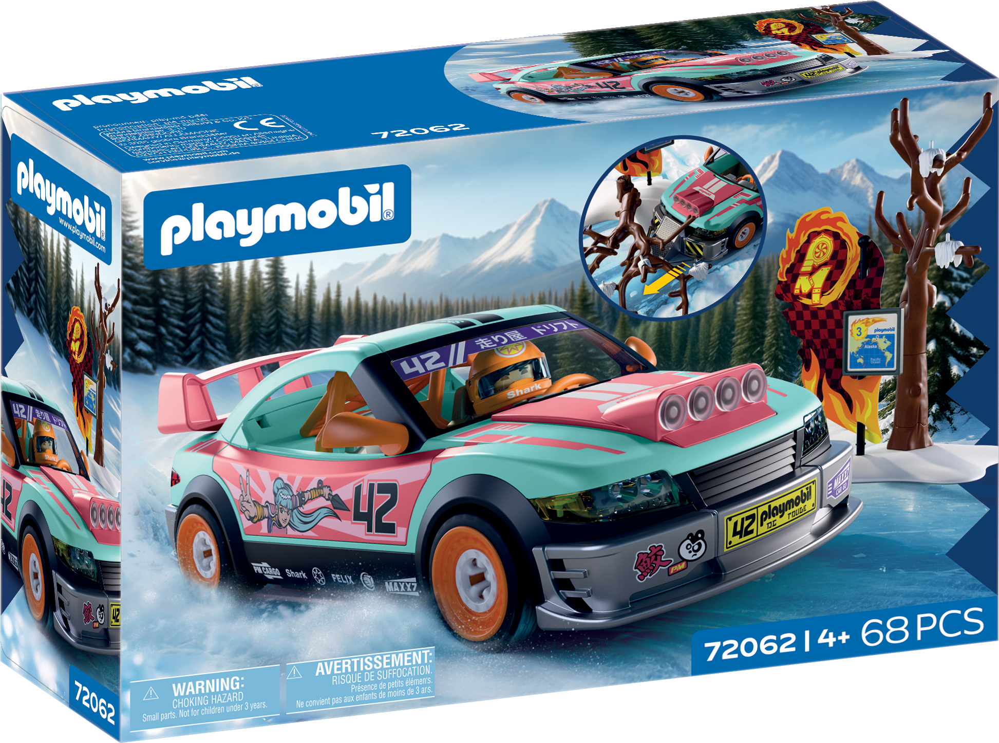 Mit dem PLAYMOBIL Offroad Tuningcar stellen sich kleine Rennfahrer den eisigen Herausforderungen des „Ring of Fire“-Rennens in Alaska! Schnee, Kälte und umgestürzte Bäume fordern Geschick und Strategie.