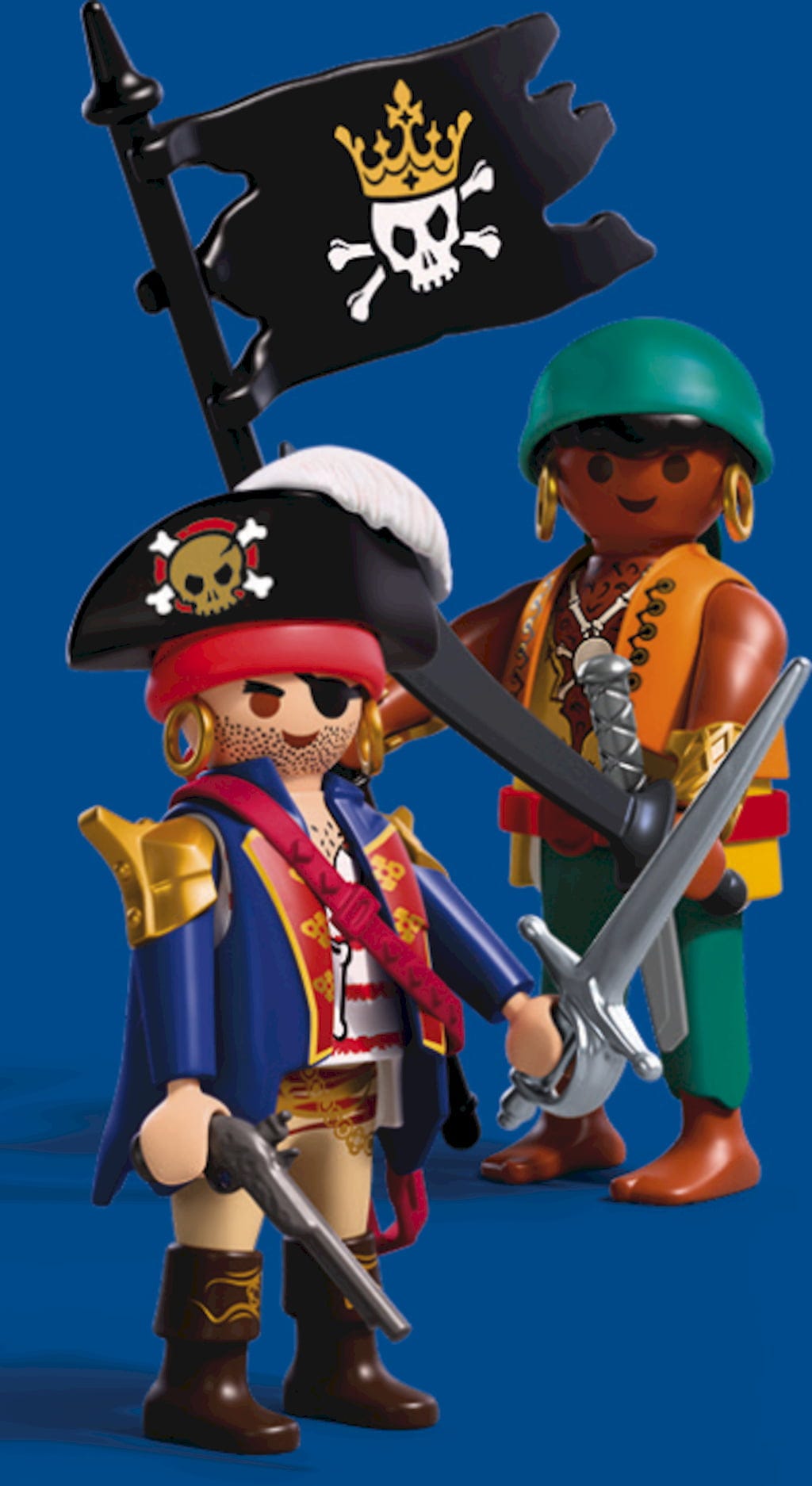 Zwei verfeindete Piraten treffen erneut aufeinander – der eine zielt mit seiner Pistole, der andere schwingt Säbel und Flagge. Mit Hüten, Klingen und flatternder Piratenflagge können Kinder actionreiche Abenteuer und fantasievolle Schlachten nachspielen.