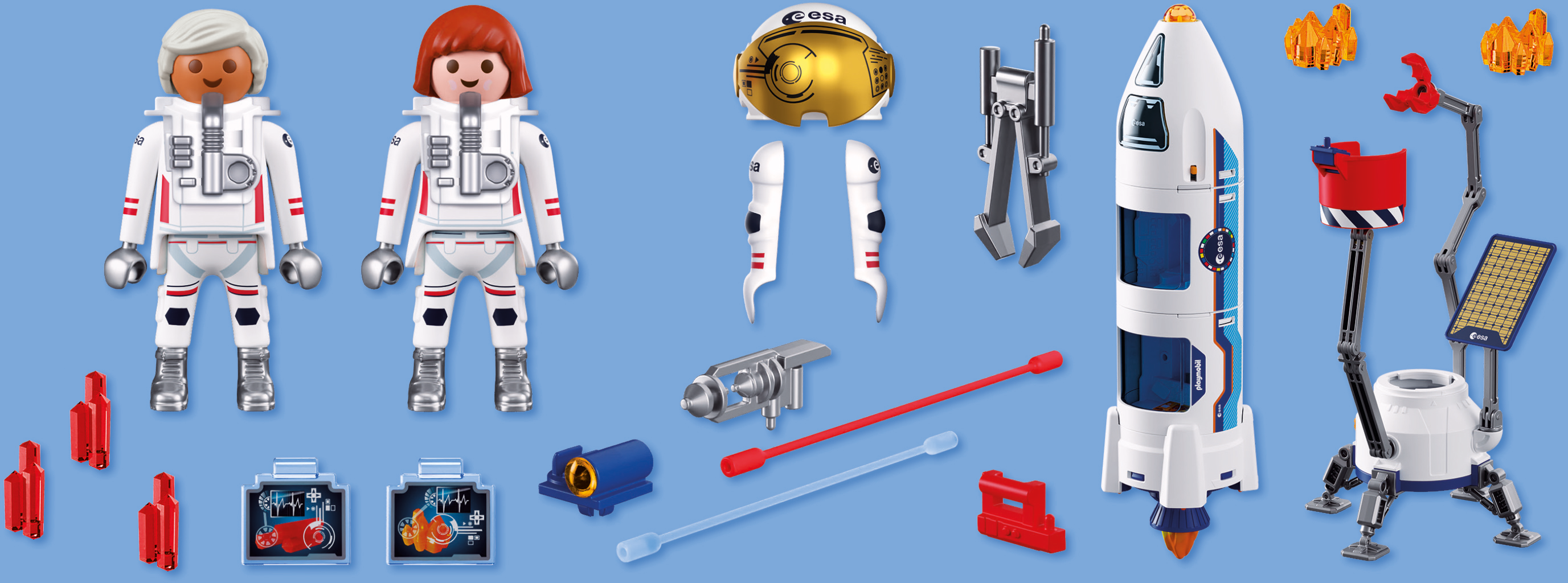 Zubehör: 2 Astronauten-Helme, 4 Armschienen, 1 Bohrgerät, 1 Rückenaufsatz, 1 Greifzange, 2 Silikonkabel, 1 modulare Rakete, 1 Raketenantrieb, 1 Startrampe, 1 Solar-Paneel, 1 Ausleger mit Wartungskorb, 1 Ausleger mit Greifer, 1 Geschoss, 3 Gesteinsproben leuchtrot, 2 Gesteinsproben leuchtorange, 2 Tablets