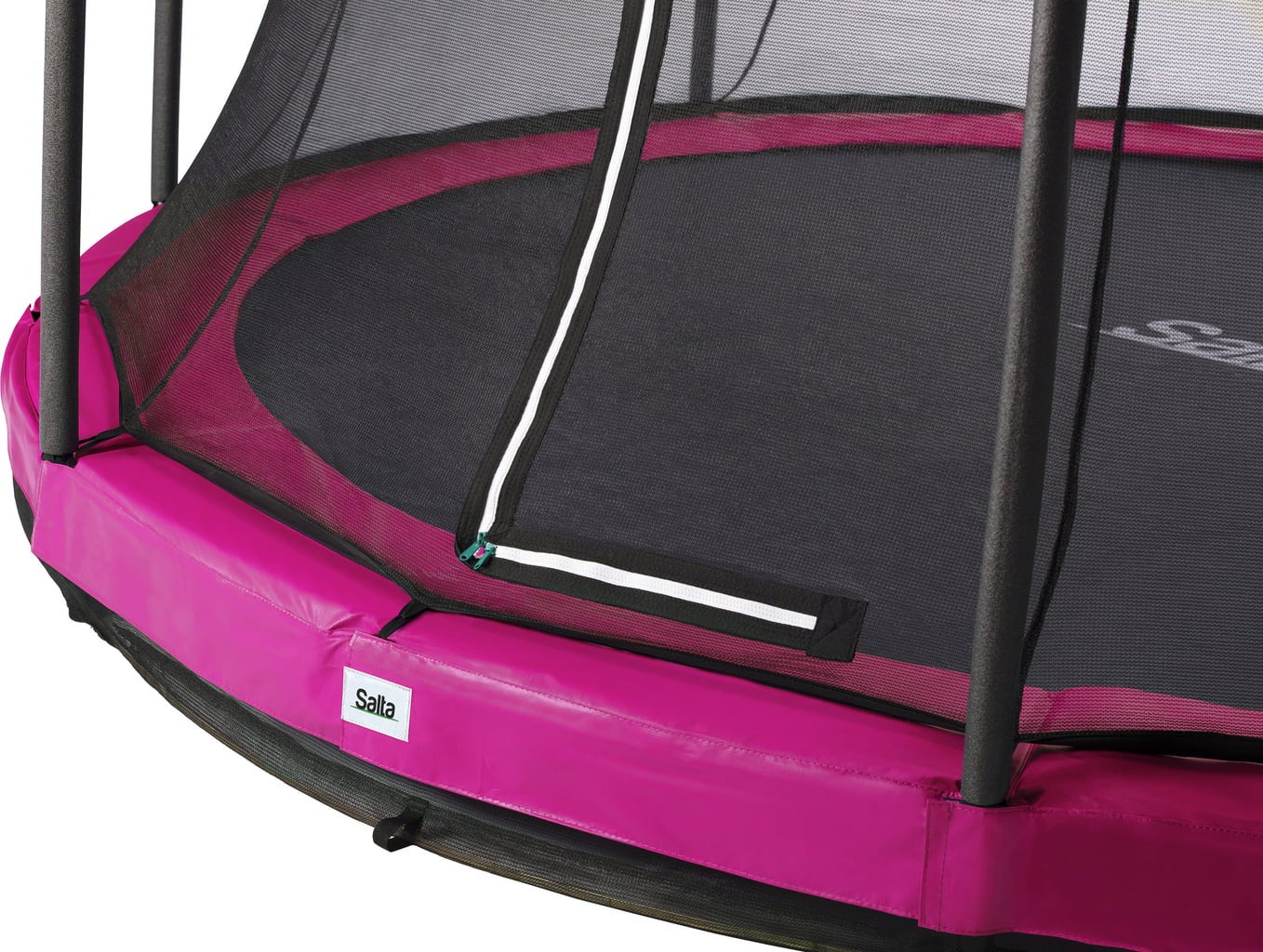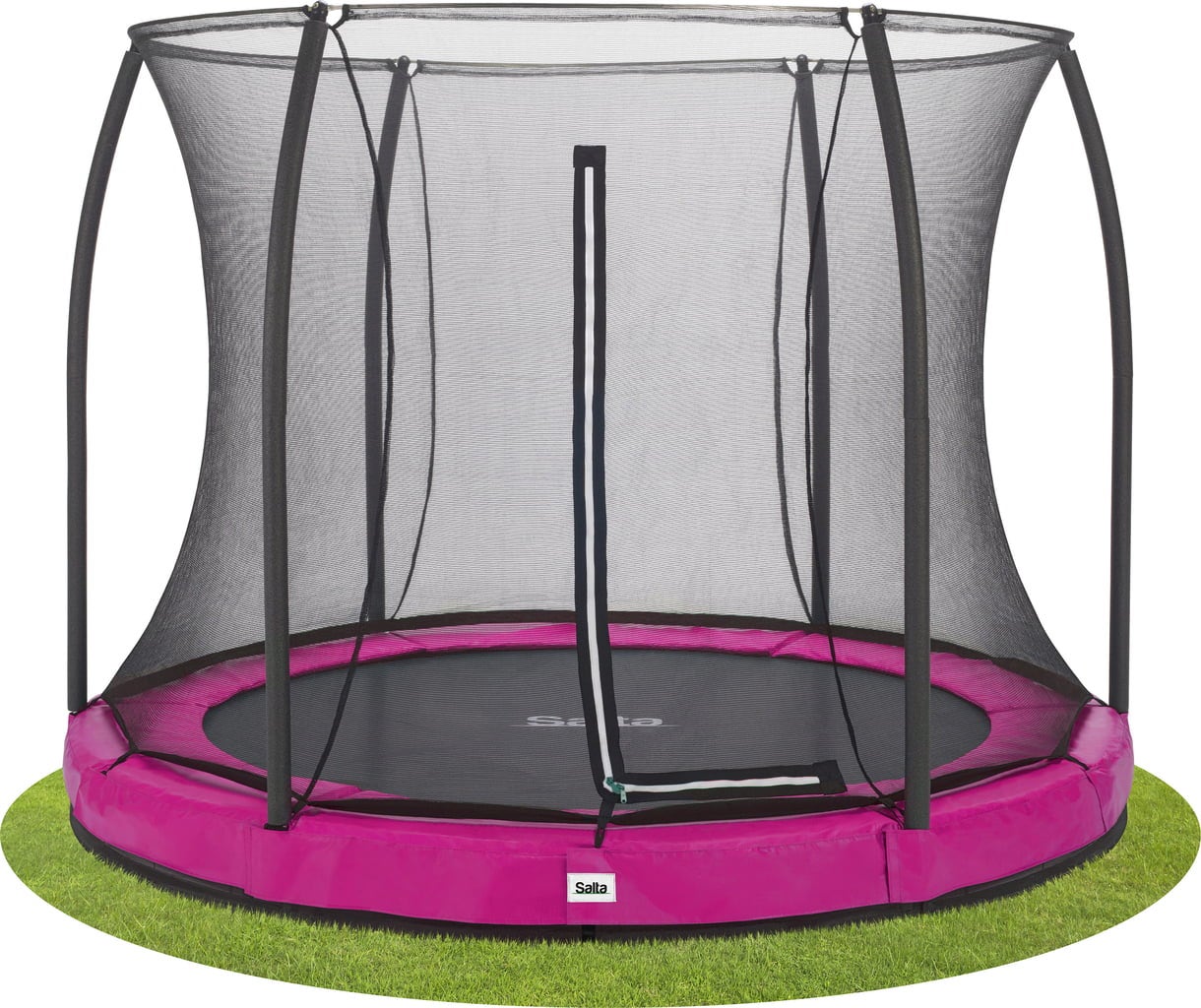 Das Salta Comfort Edition Ground bietet ein erstklassiges Sprungerlebnis zum unschlagbaren Preis. Mit seinem modernen und stilvollen Design fügt es sich harmonisch in jeden Garten ein und ist perfekt für Anfänger geeignet. Für ein komfortables und dynamisches Springen ist das Trampolin an der Unterseite mit einem speziellen Netz ausgestattet, das die beim Springen entstehende Luft optimal verteilt. Die mitgelieferten robusten Bodenanker sorgen für eine besonders feste Verankerung im Untergrund. Mit einer Höhe von nur 20 cm über dem Boden ermöglicht das Trampolin einen bequemen Einstieg. Der verzinkte Stahlrahmen mit schwarz glänzender Beschichtung bietet eine langlebige und stabile Konstruktion. Das feinmaschige Sicherheitsnetz mit doppelseitigem Reißverschluss bietet optimalen Schutz und lässt sich von innen sowie außen leicht öffnen und schließen.
