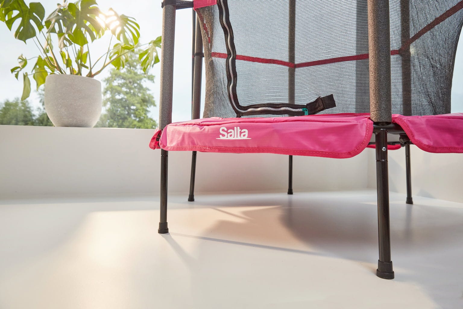 Das Salta Trampolin Junior sorgt für jede Menge Spielspaß und körperliche Bewegung. Für die nötige Sicherheit sorgt ein weiches, an der Sprungmatte befestigtes Netz und eine elastische Federung mittels Bänder, die gelenkschonendes und geräuschloses Springen ermöglicht. Der verzinkte Stahlrahmen mit Schutzpolster sorgt für Langlebigkeit, während die niedrige Einstiegshöhe von 35 cm den Zugang erleichtert. Dank seiner kompakten Größe ist es sowohl für den Innen- als auch den Außenbereich geeignet.