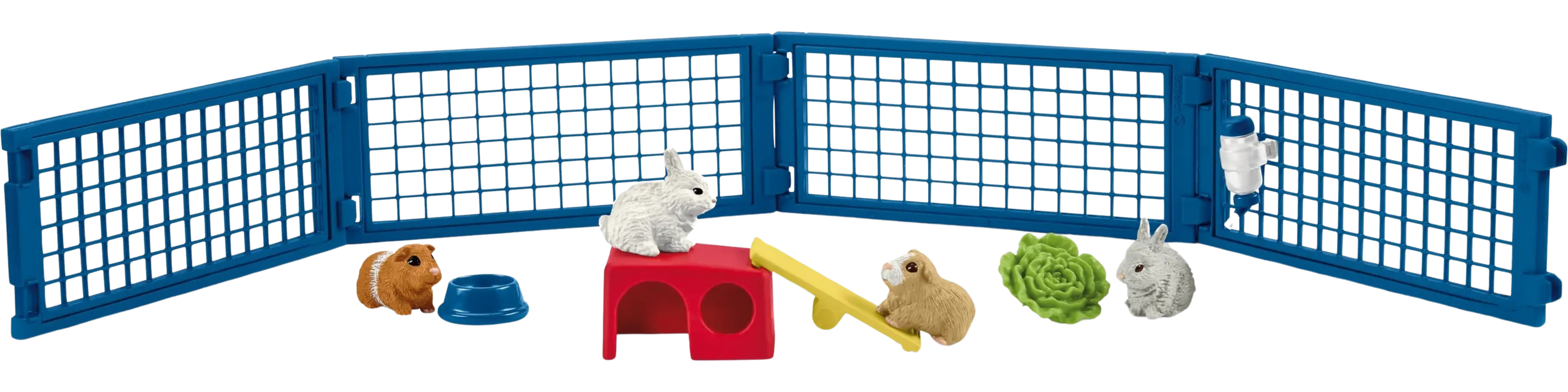 Im Zuhause für Kaninchen und Meerschweinchen gibt es viel zu entdecken: Die kleinen Tiere verstecken sich im Häuschen, knabbern am Salat, trinken aus der Flasche oder klettern über die praktische Spielzeugwippe. Die Zaunteile lassen sich beliebig zusammenstecken und mit anderen Schleich® Zäunen kombinieren, sodass Kinder ihre eigene kleine Tierwelt gestalten können – perfekt für alle kleinen Tierfreunde!