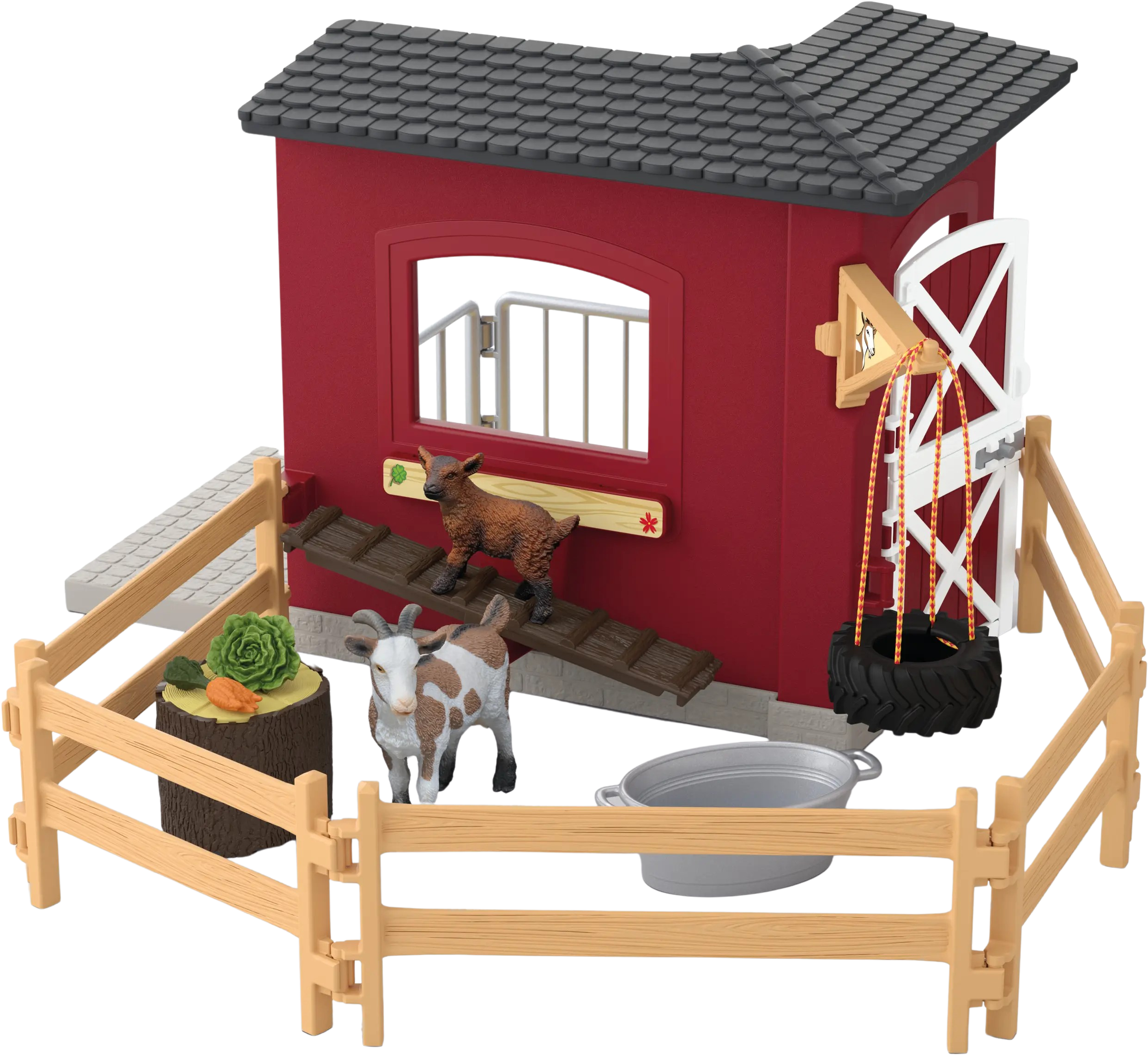 Mit dem Ziegenstall von schleich® FARM WORLD erleben Kinder den Alltag auf dem Bauernhof hautnah. Während die Mama-Ziege gemütlich ihr frisches Gemüse und knackige Möhren frisst, entdeckt das kleine Zicklein die Wippe und den Reifenschaukel und zeigt seine Kletterkünste. Nach viel Spielspaß macht es sich erschöpft auf dem Strohlager im Stall gemütlich. Ein liebevolles Set, das den Bauernhof-Alltag spielerisch vermittelt und jede Menge Spaß beim Füttern, Spielen und Entdecken bietet.