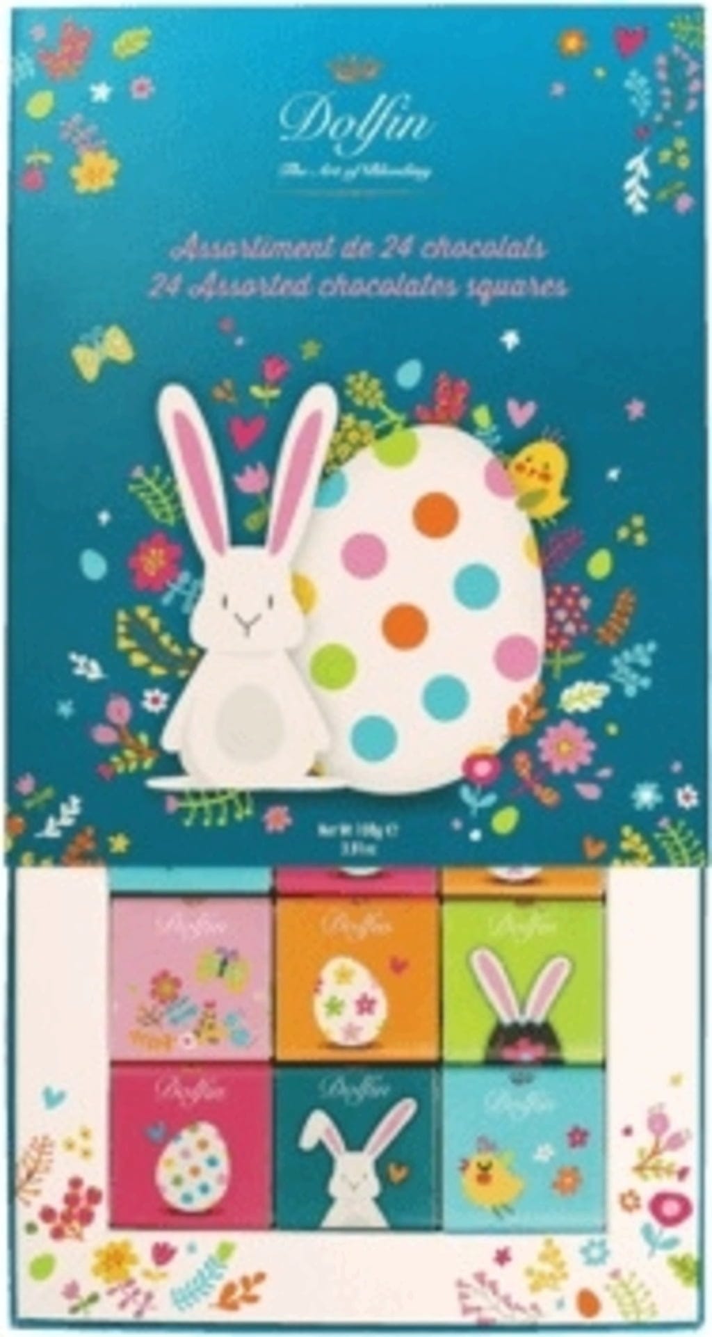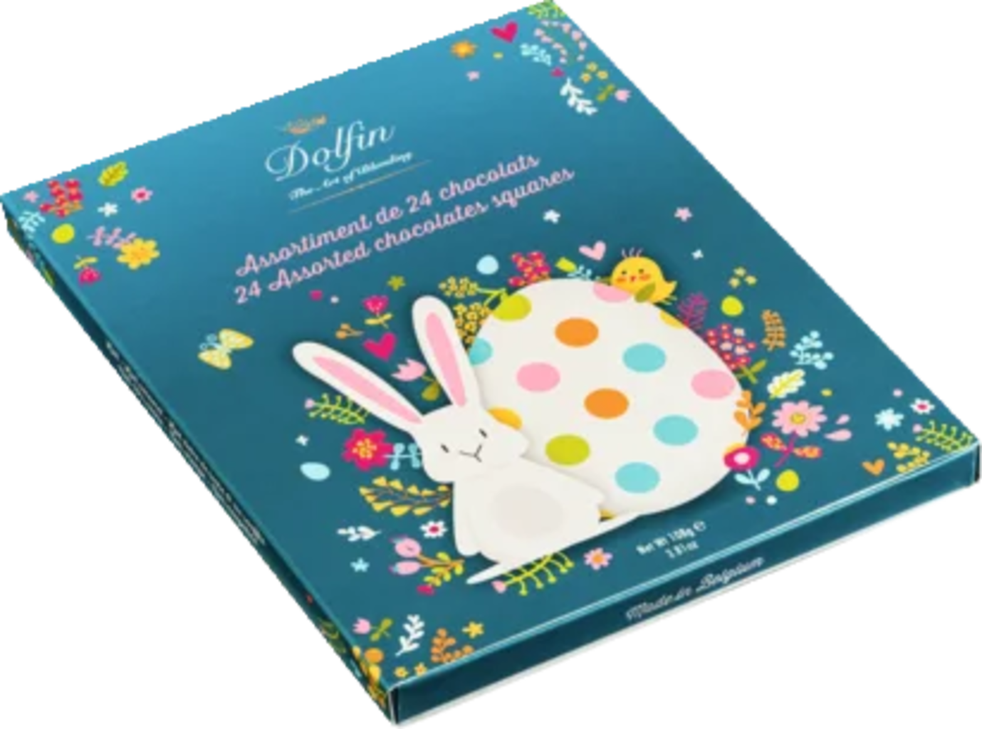 Erlebe die ganze Bandbreite belgischer Chocolatier-Kunst mit dieser festlichen Auswahl von Dolfin. In der ansprechenden Geschenkpackung mit österlichem Motiv verbergen sich 24 einzeln verwickelte Schokoladencarrés, die zum Entdecken und Teilen einladen. Die Mischung vereint verschiedene Variationen aus Zartbitter- und Vollmilchschokolade, veredelt mit erlesenen Zutaten wie fruchtiger Orange, aromatischem Kaffee, Nougatine oder Karamell. Getreu der Philosophie „The Art of Blending“ kombiniert die Manufaktur feinste Kakaomasse mit Gewürzen und Früchten zu einem harmonischen Geschmackserlebnis.