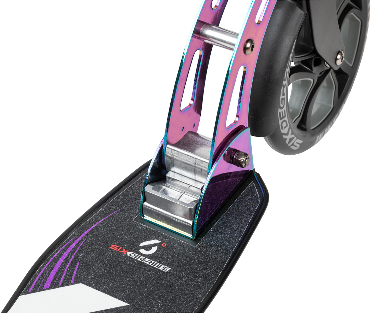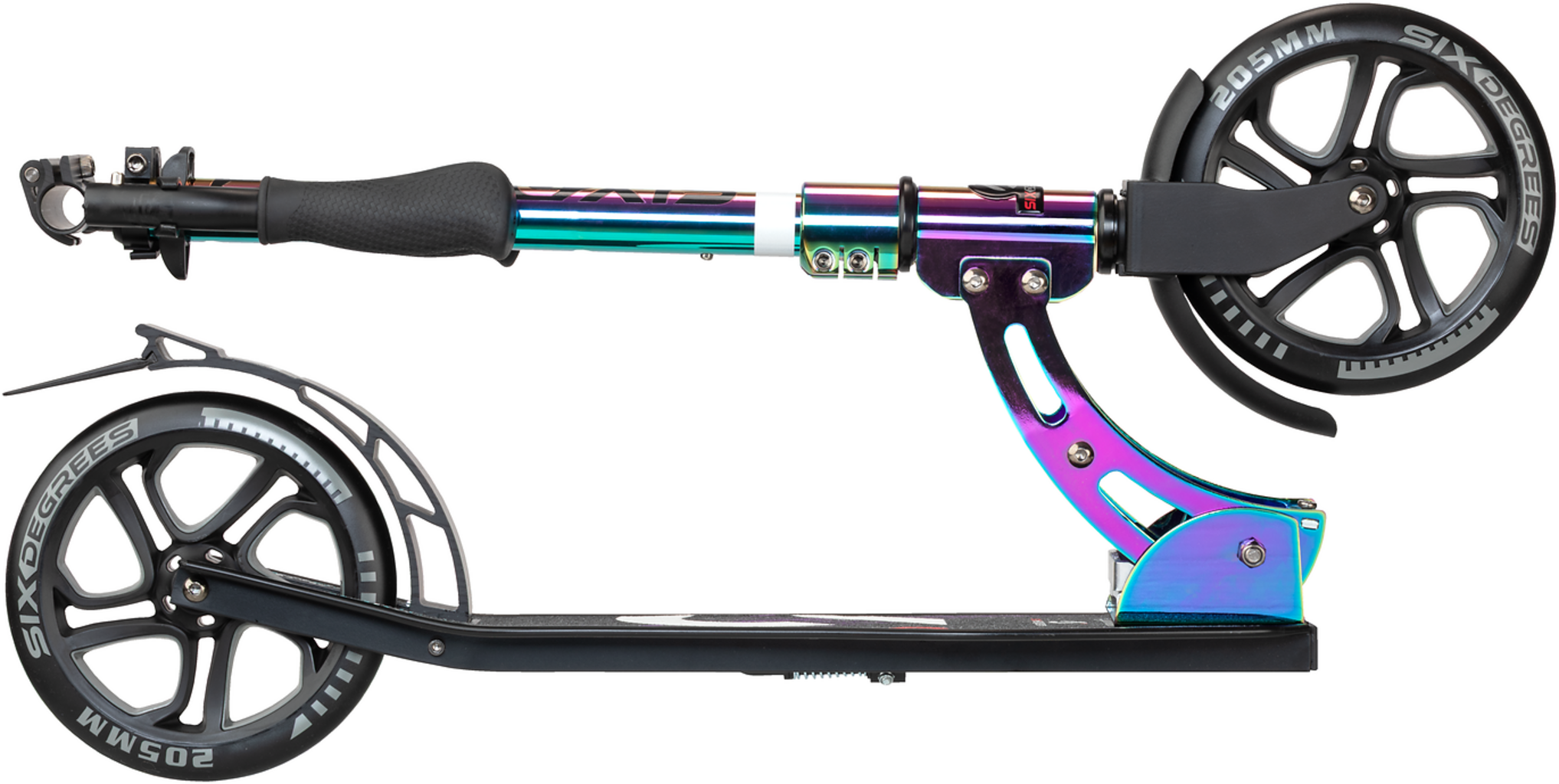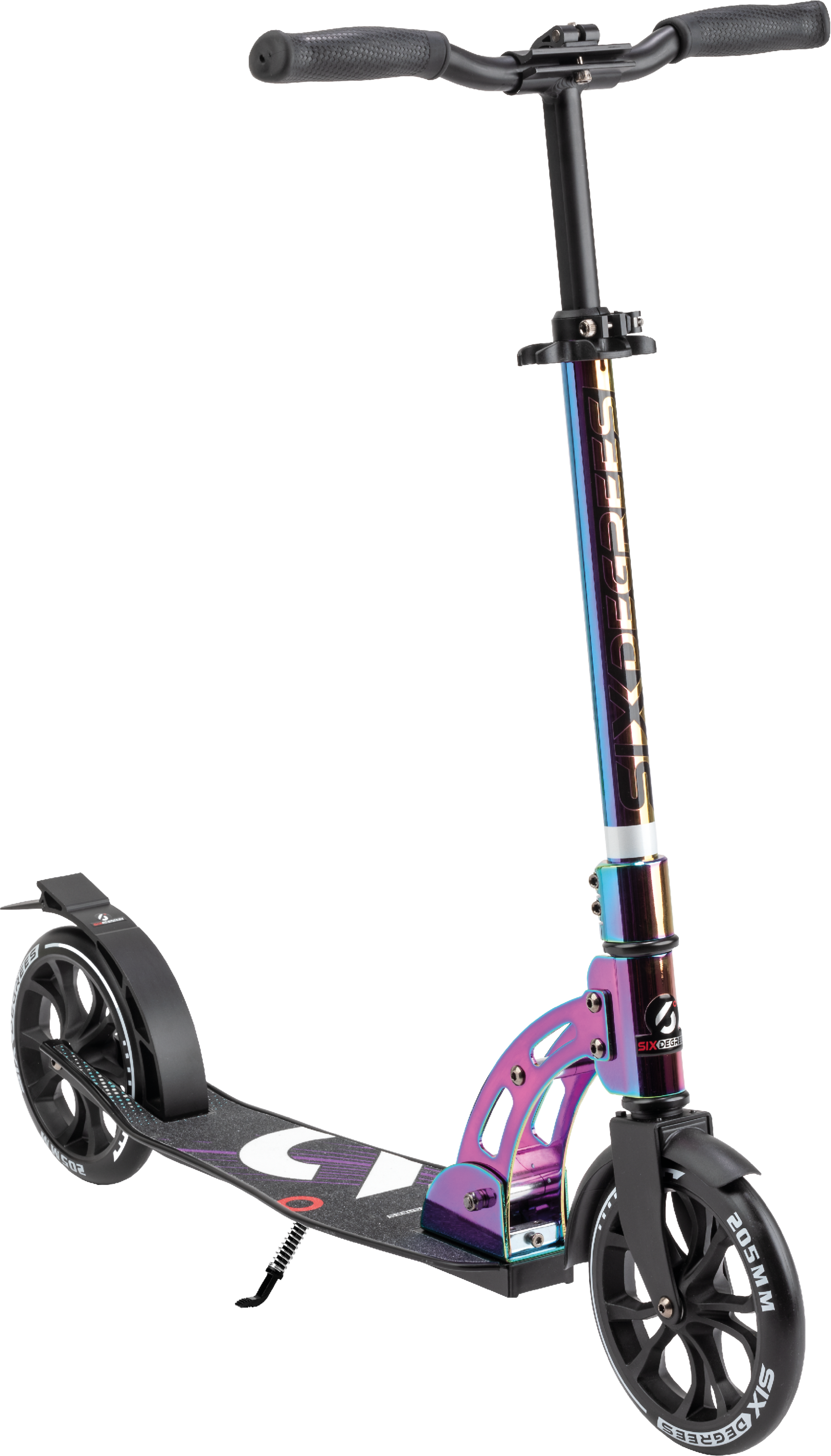 Der praktisch klappbare Six Degrees Aluminium Scooter 205 mm lässt dich regelrecht über den Asphalt gleiten.