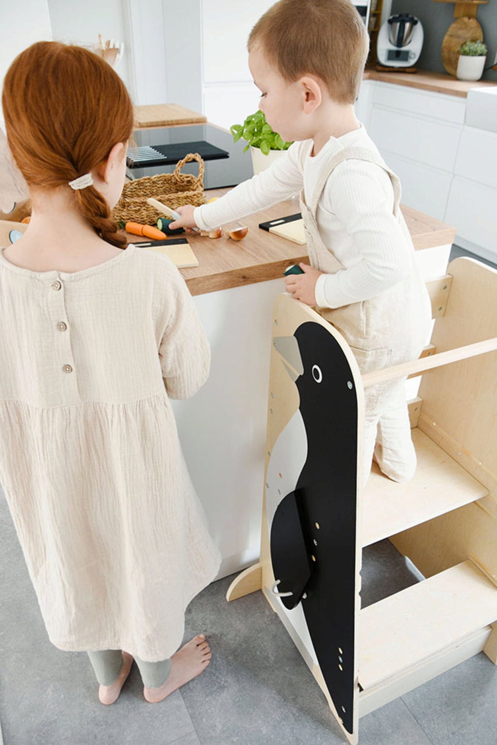 Der Lernturm Pinguin „Wildlife“ bringt Kinder auf Augenhöhe mit den Erwachsenen und ermöglicht sicheres Mitmachen im Alltag. Dank höhenverstellbarer Stufen wächst der Turm mit dem Kind mit und bietet gleichzeitig Stauraum über die hochklappbaren Flügel. Ein durchdachtes Montessori-Möbelstück, das Selbstständigkeit, Entdeckergeist und spielerisches Lernen optimal unterstützt.