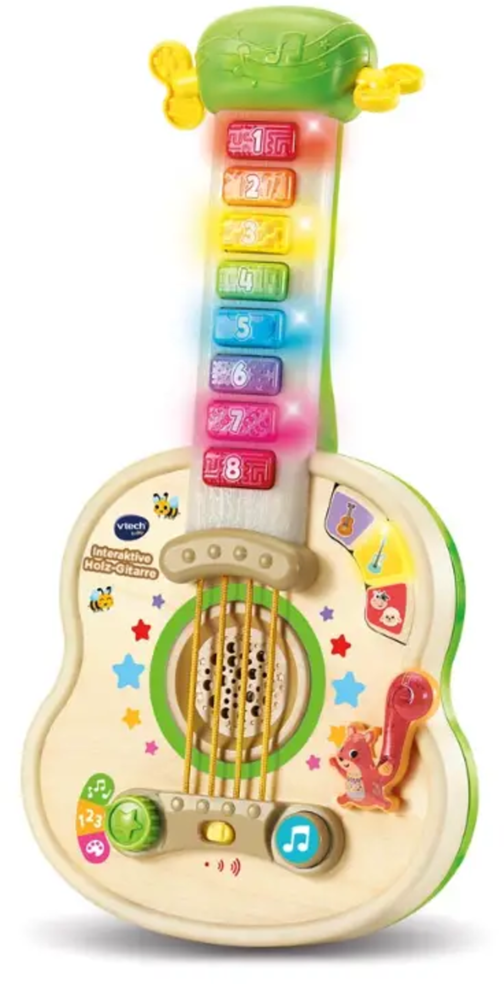 Diese interaktive Holz-Gitarre lädt Kinder dazu ein, erste musikalische Erfahrungen spielerisch zu entdecken. Hochwertiges, nachhaltig produziertes Holz kombiniert mit Licht-, Sound- und Lerneffekten sorgt für abwechslungsreichen Spielspaß. Dabei werden Motorik, Rhythmusgefühl und auditive Wahrnehmung gezielt gefördert, ohne zu überfordern.